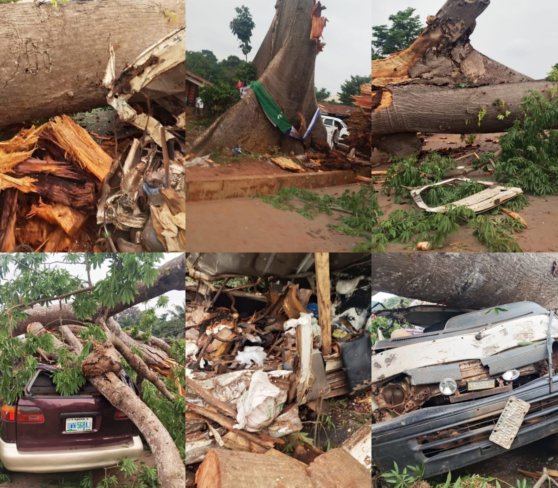 This was a weather-related accident, not a criminal act — a large tree collapse due to natural factors tragically claimed lives as people waited in commercial vehicles in the Awhum community of Enugu State.