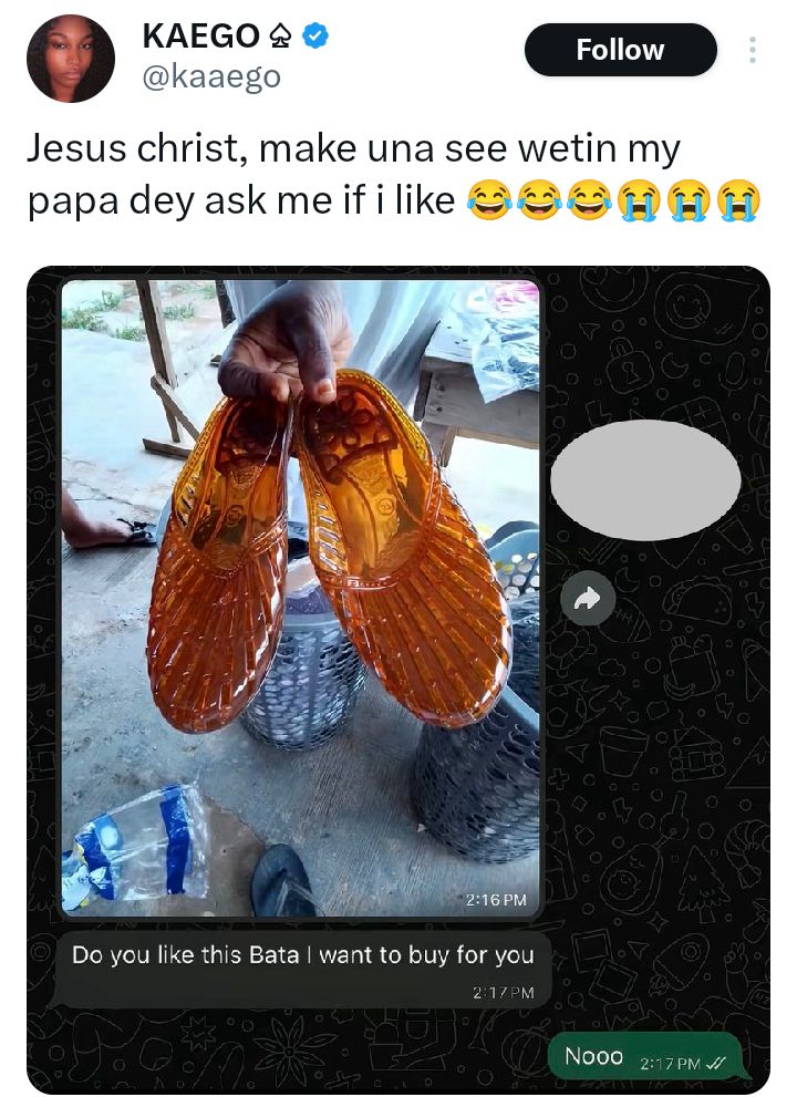 A young Nigerian lady, Kaego, has shared a photo of Bata shoes her father wanted to buy for her. “Jesus christ, make una see wetin my papa dey ask me if i like, she wrote via her X handle on Friday, February 20.