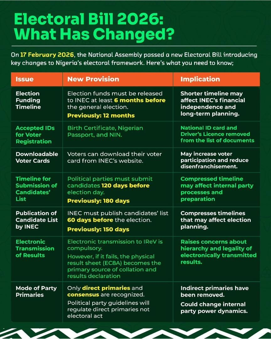 The National Assembly has outlined major reforms introduced in the Electoral Act 2026, including mandatory electronic transmission of results, compulsory use of the Bimodal Voter Accreditation System (BVAS), the creation of a dedicated fund for the Independent National Electoral Commission (INEC), and stricter regulations for political parties.