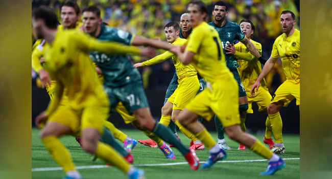 Tottenham Hotspur’s English forward Dominic Solanke (3R), Bodoe/Glimt’s Norwegian midfielder Fredrik Sjovold (C) and other players vie for the ball during the UEFA Europa League semi-final second leg football match between Bodoe/Glimt and Tottenham Hotspur in Bodoe, Norway on May 8, 2025. (Photo by Mats Torbergsen / NTB / AFP)